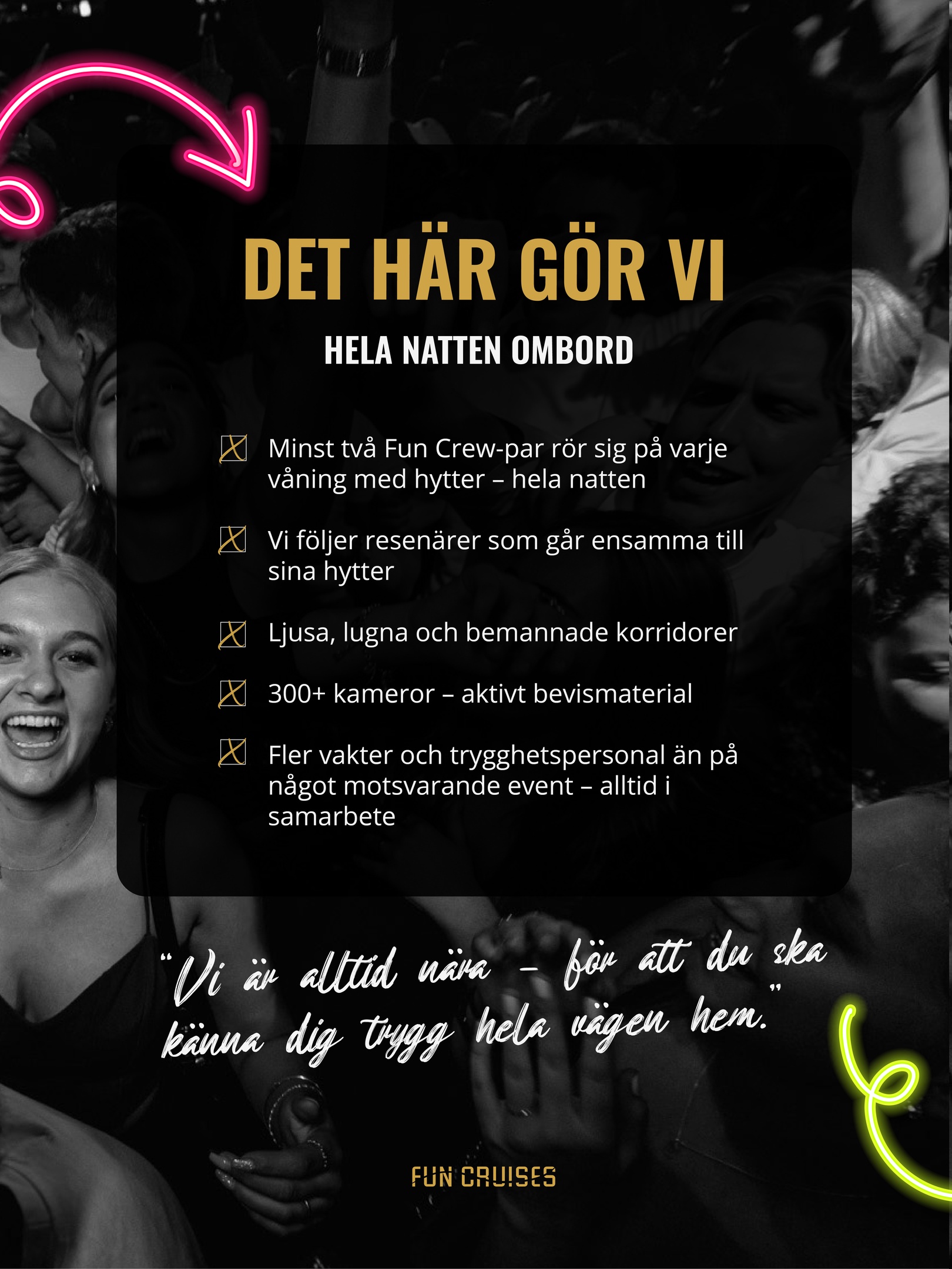 Fun Crew finns ute i korridorer och gemensamma utrymmen hela natten – just för att vara synliga, förebygga problem och finnas till hands om något känns fel. Men vi har inte möjlighet att hjälpa till att leta efter vänner som du tappat bort tillfälligt. Vi kan inte gå in i hytter utan tillstånd, och det är viktigt att vi behåller vår närvaro där flest människor rör sig – det är där vi gör störst skillnad.